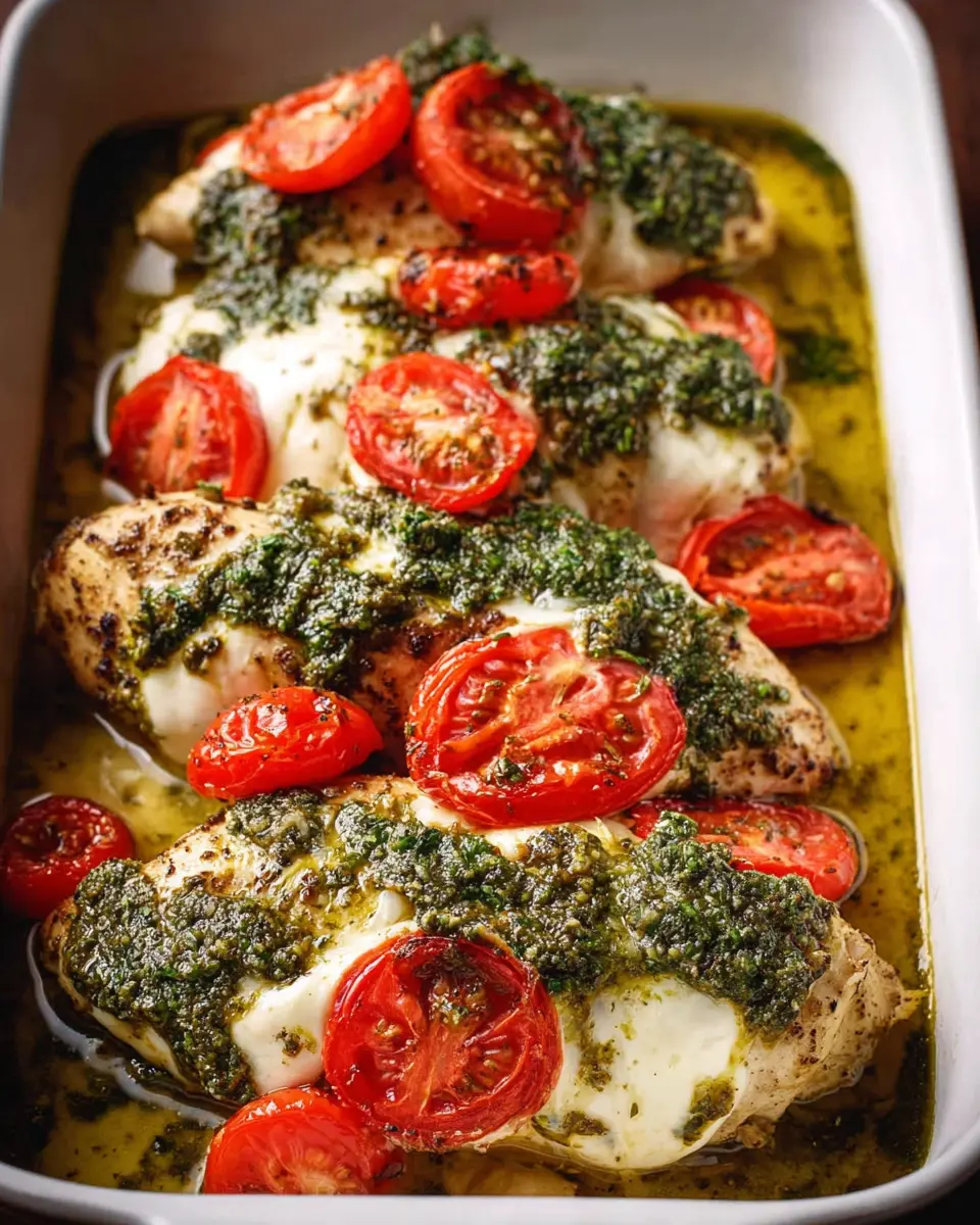 Basil Pesto Tomato Mozzarella Chicken Bake