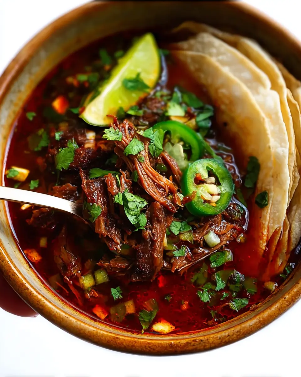 Your birria is finally ready! Serve it hot in bowls, topped with fresh cilantro, diced onion, and accompanied by warm corn tortillas. Each bite is a burst of flavor — enjoy the hearty goodness of your homemade birria!