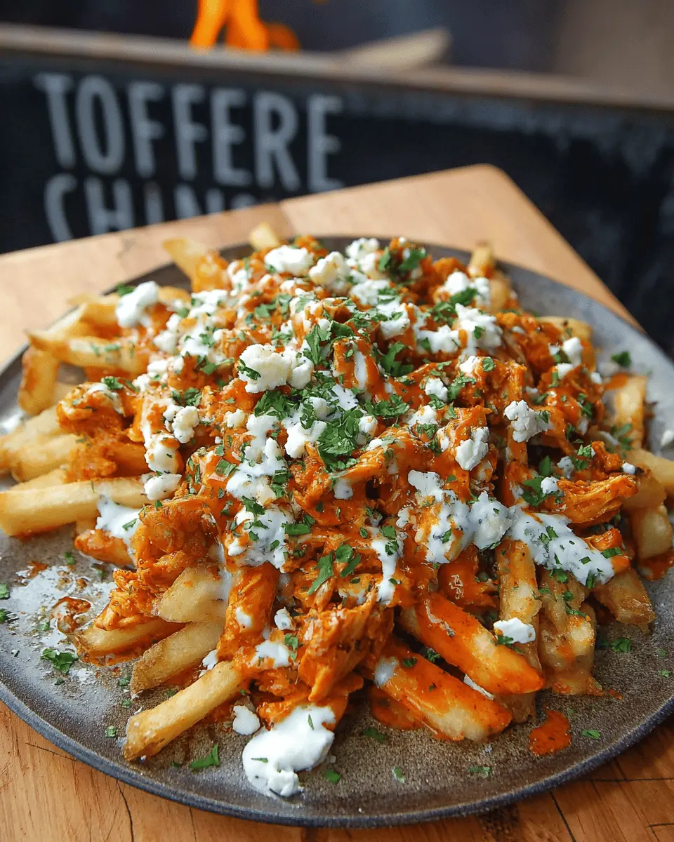 Imagine this: golden, crispy fries topped with juicy, grilled chicken tossed in spicy buffalo sauce, melted cheese, and a drizzle of creamy blue cheese sauce. It’s a dish that delivers on taste and satisfaction. The contrast of flavors and textures—from the crunch of the fries to the succulence of the chicken—makes each bite a delightful experience.