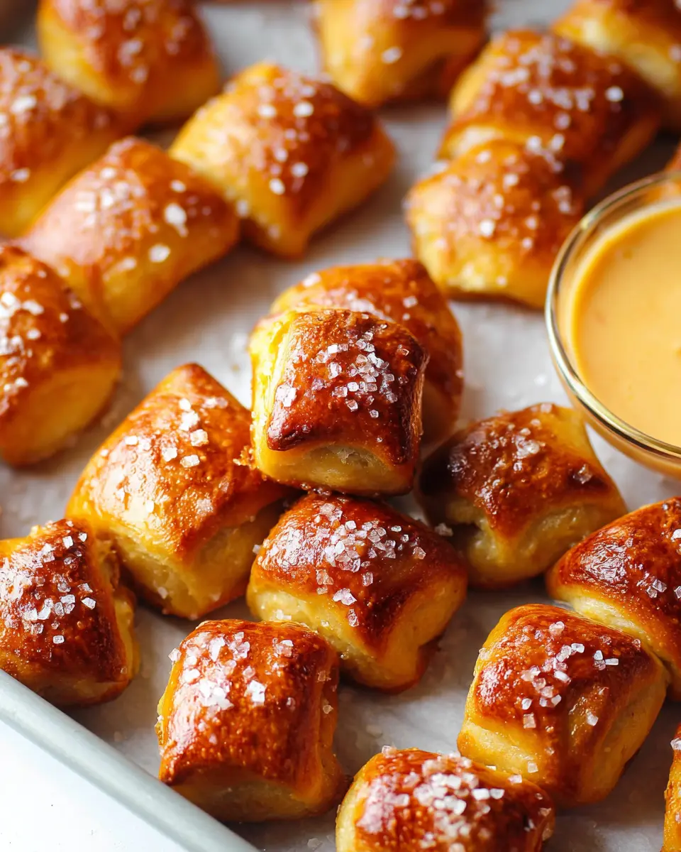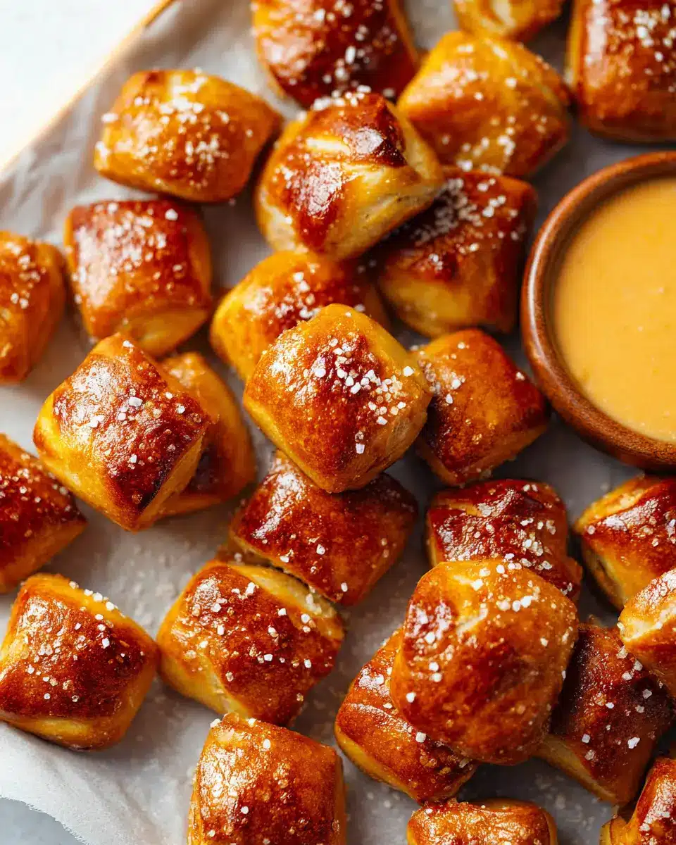 Before baking, brush each pretzel bite with an egg wash (a whisked egg mixed with a tablespoon of water) and sprinkle generously with coarse sea salt. This step adds flavor and an irresistible shine to your pretzel bites.