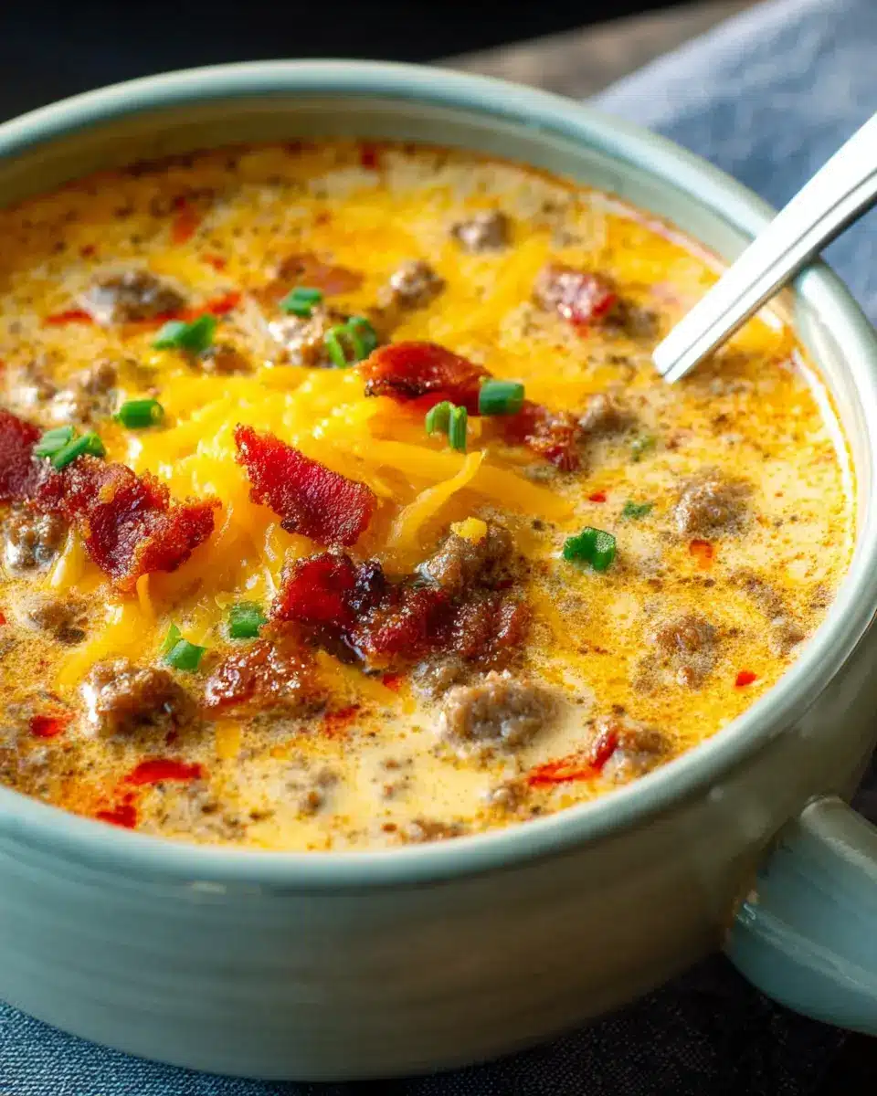 Cheeseburger soup is a delightful twist on a classic favorite that brings warmth and comfort to any dining table. This creamy, savory dish is perfect for chilly evenings when you’re craving the flavors of a cheeseburger but want something a little different. Think of it as all your favorite burger ingredients mingling in a hearty broth, topped with gooey cheese and crispy turkey bacon. With its rich, satisfying texture, cheeseburger soup feels like a big hug in a bowl.