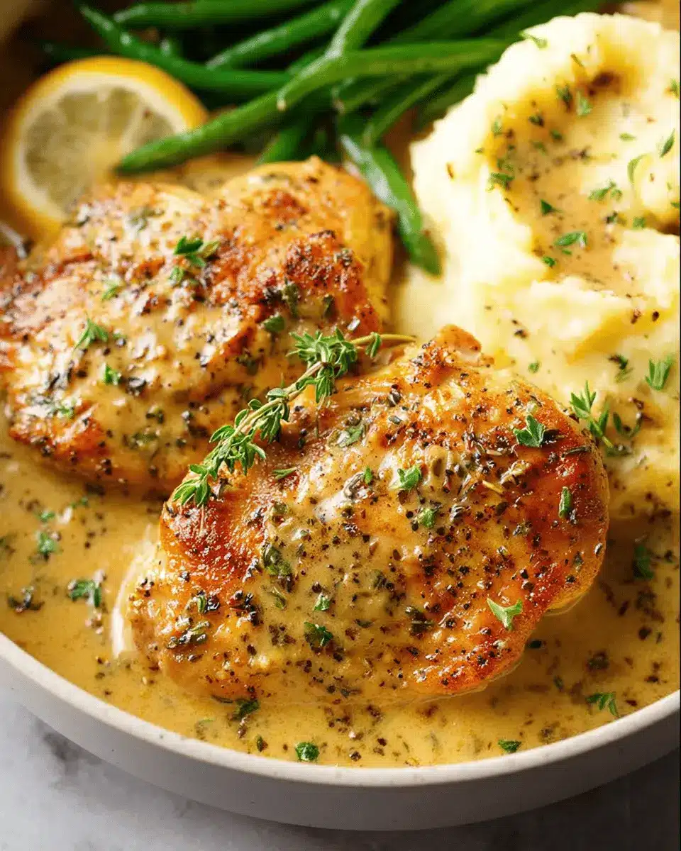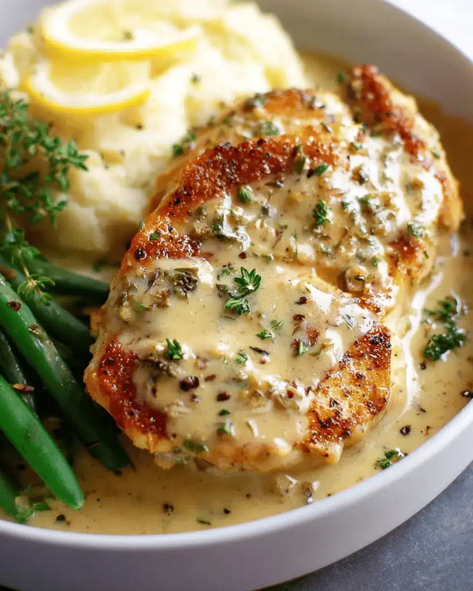 Now, add Worcestershire sauce, chicken broth, and your favorite sauce seasonings—dried parsley, mustard powder, oregano, and basil. Bring the mixture to a boil. If you prefer a thicker sauce, you can mix cornstarch with cold water and stir it in. After reducing the heat, slowly whisk in heavy cream and freshly grated Parmesan cheese. Add the seared chicken back to the skillet and let it bask in the sauce for about five minutes. Before serving, stir in two tablespoons of fresh lemon juice for an undeniably fresh finish. Garnish with parsley, and enjoy this comforting dish served over mashed potatoes or roasted vegetables!