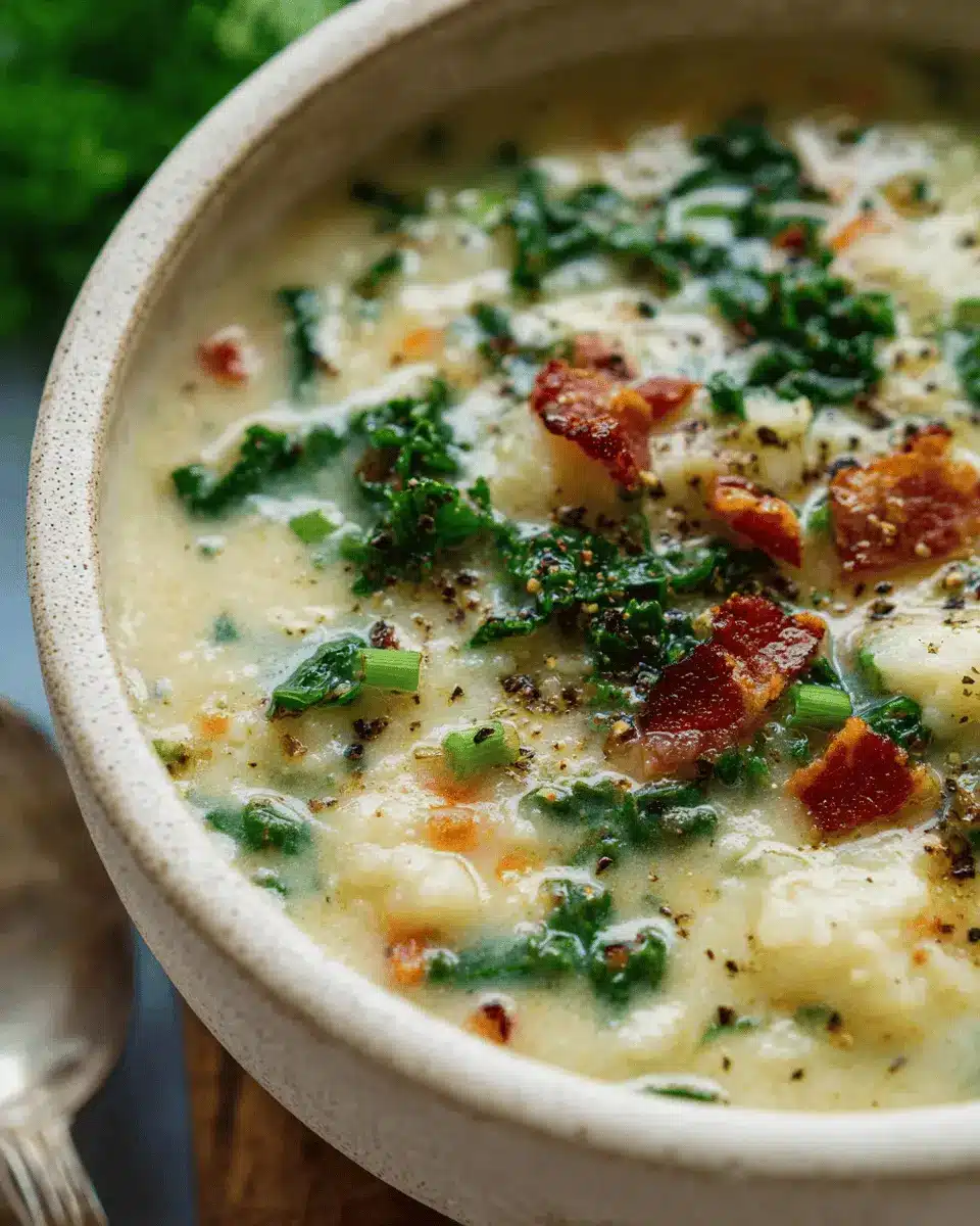 - Stir in half and half and chopped kale leaves. Heat the soup until the kale slightly wilts. Serve the soup with sliced green onion and chopped cooked bacon for garnish.