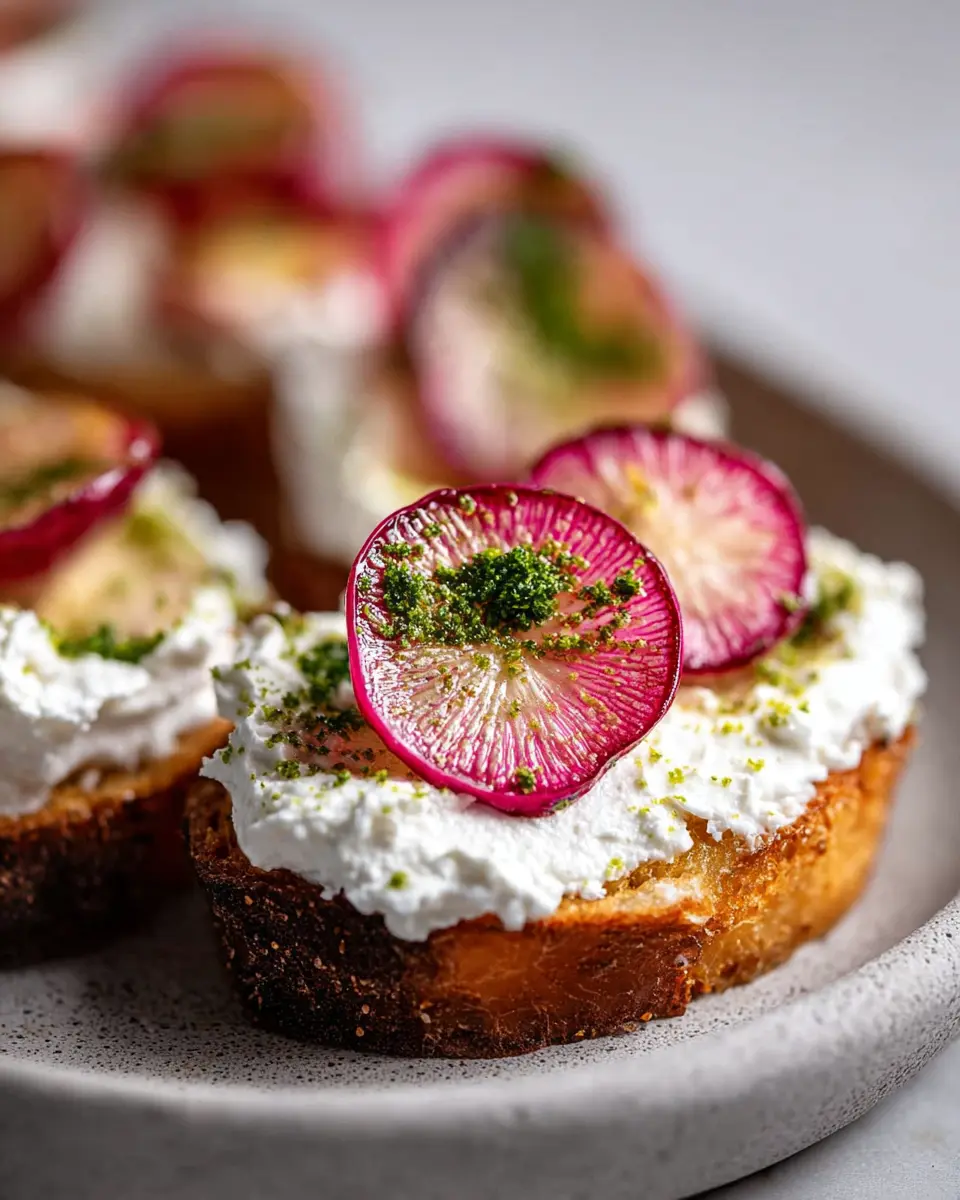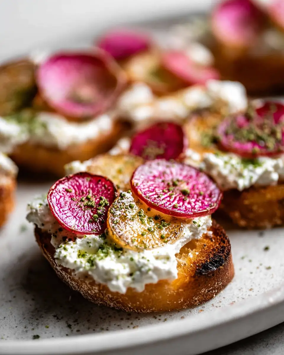 - Spread whipped feta on a plate, top with crispy radishes, and sprinkle with pistachio-dill dust.