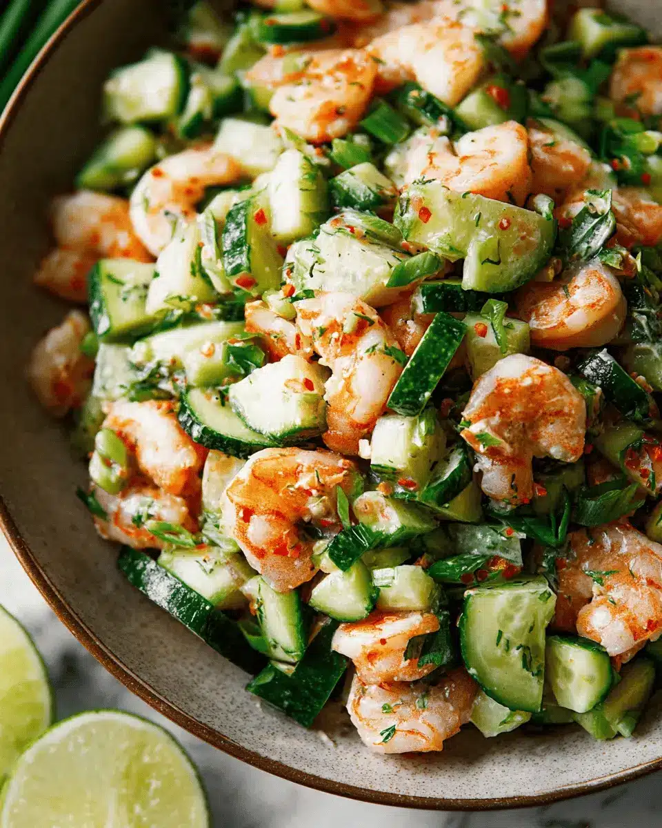 Health Benefits: Shrimp is a fantastic source of lean protein, providing essential nutrients like omega-3 fatty acids that are crucial for heart health. Coupled with the high-water content of cucumbers, this salad helps keep you hydrated.