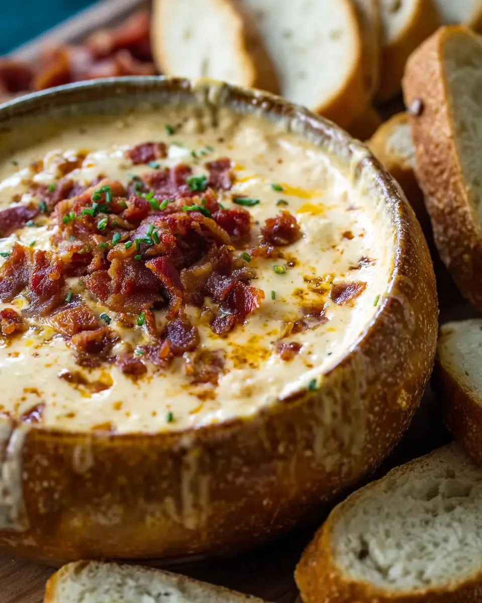 Once everything is well-mixed and you’ve achieved that creamy dip consistency, it’s time to present your masterpiece. Pour the dip into a hollowed-out bread bowl or any serving dish you prefer. Garnish with the remaining turkey bacon, a sprinkle of extra cheese, and a handful of chopped chives for a pop of color.
