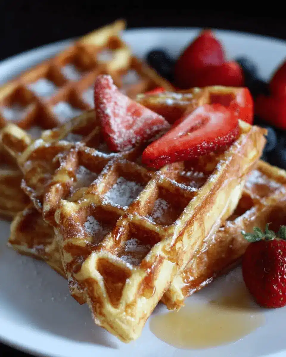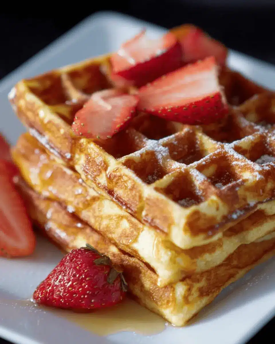 When the waffles are done, carefully lift them out of the waffle iron. They should have a gorgeous golden-brown color and a crispy texture. If you’re lucky enough to have leftover batter, feel free to make an extra batch! Serve your easy French toast waffles warm, topped with a dusting of powdered sugar, fresh berries, or even a drizzle of maple syrup. You can always pair them with turkey bacon or chicken ham for a complete meal.