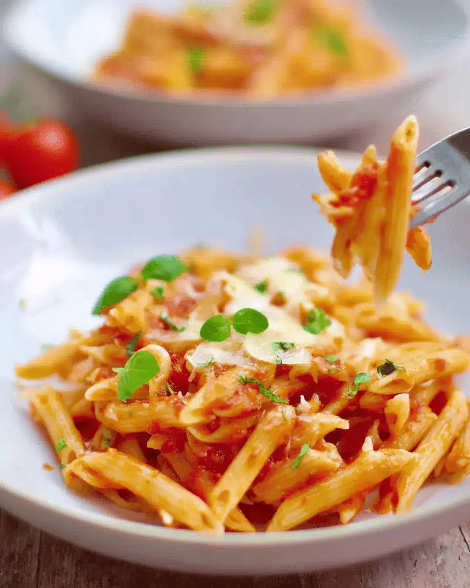 The preparation time for this easy tomato pasta dish is just 5 minutes. Perfect for those busy weeknights when you want a tasty meal without the hassle!