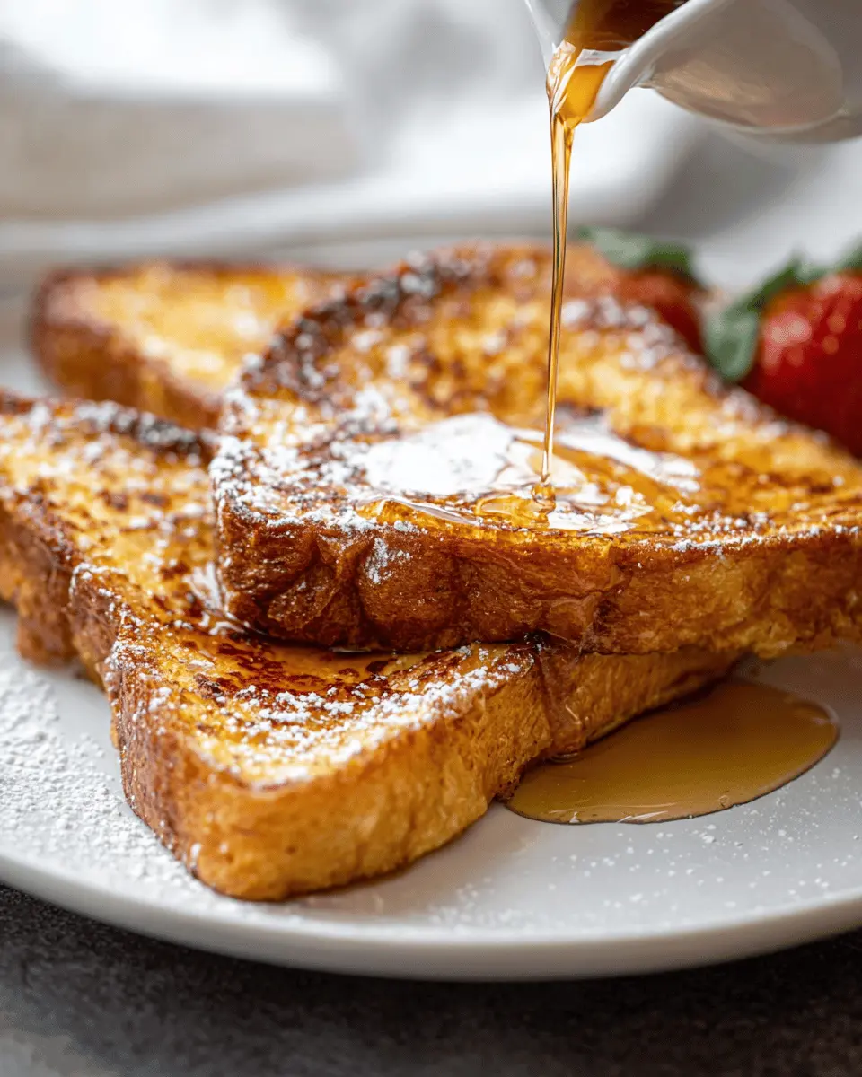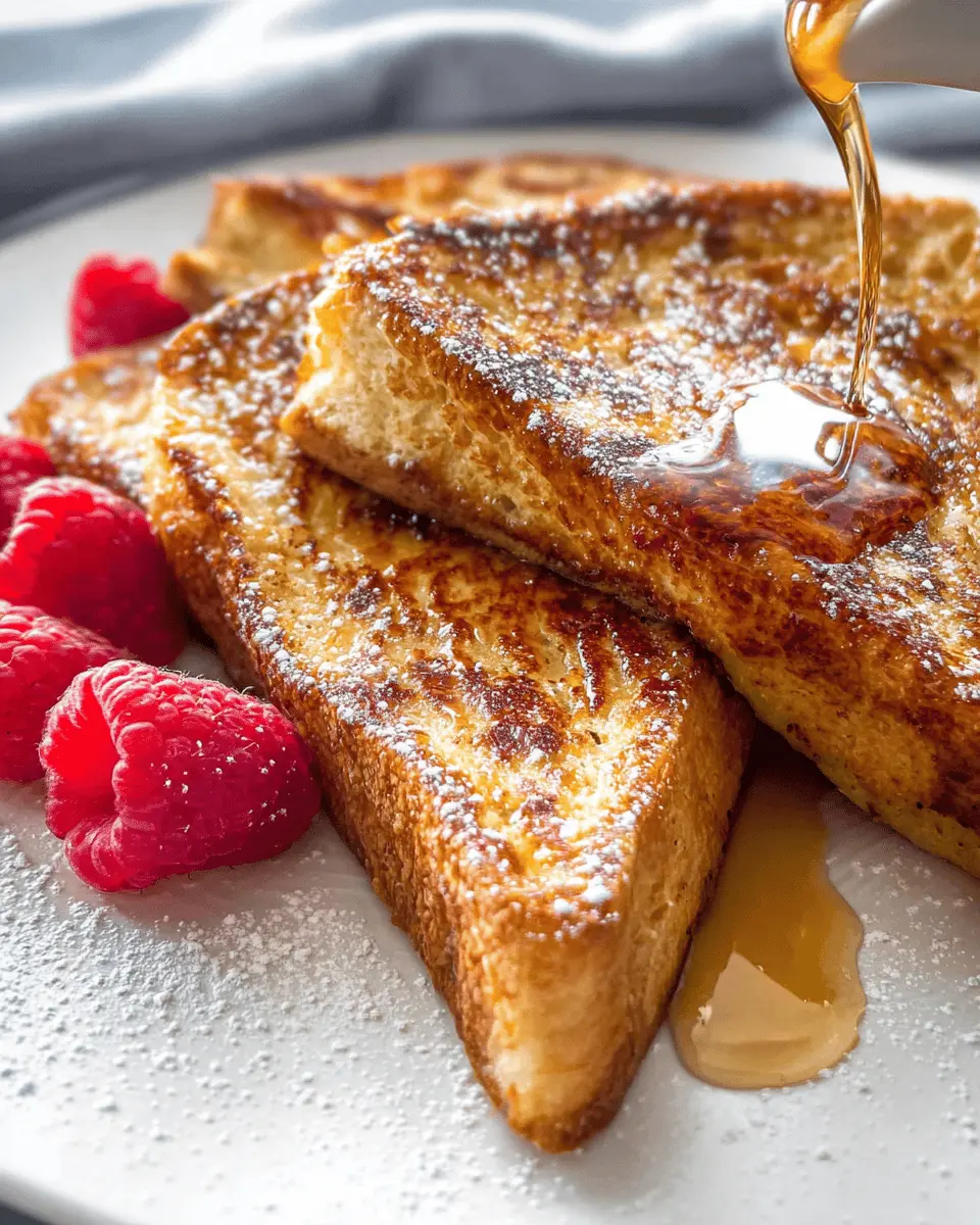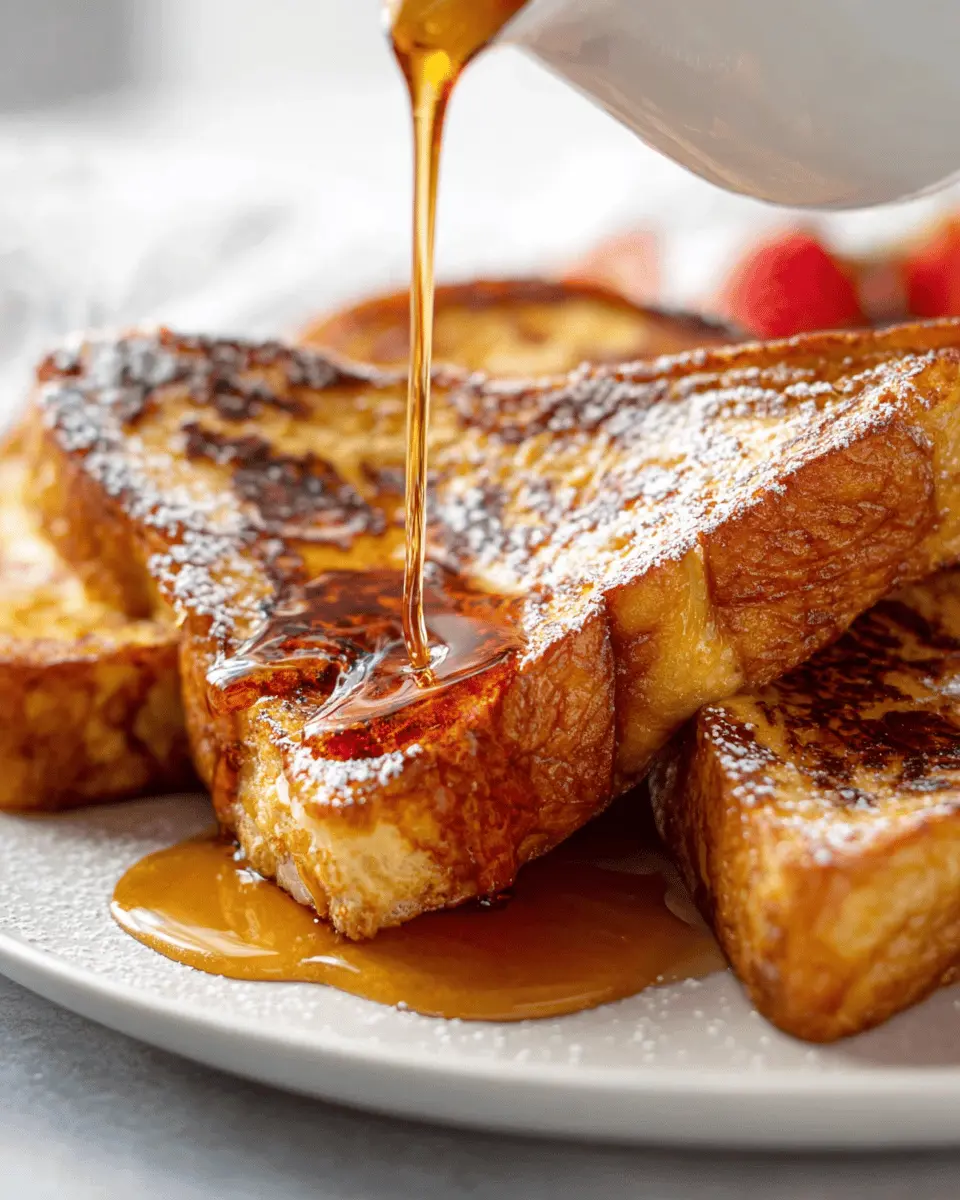 The moment we’ve all been waiting for! Right before serving, dust the crispy toast with powdered sugar and drizzle over your favorite maple syrup. You can also pair your French toast with a side of turkey bacon or chicken ham if you're feeling fancy! What toppings will you choose? Fresh berries or whipped cream could add even more delight.