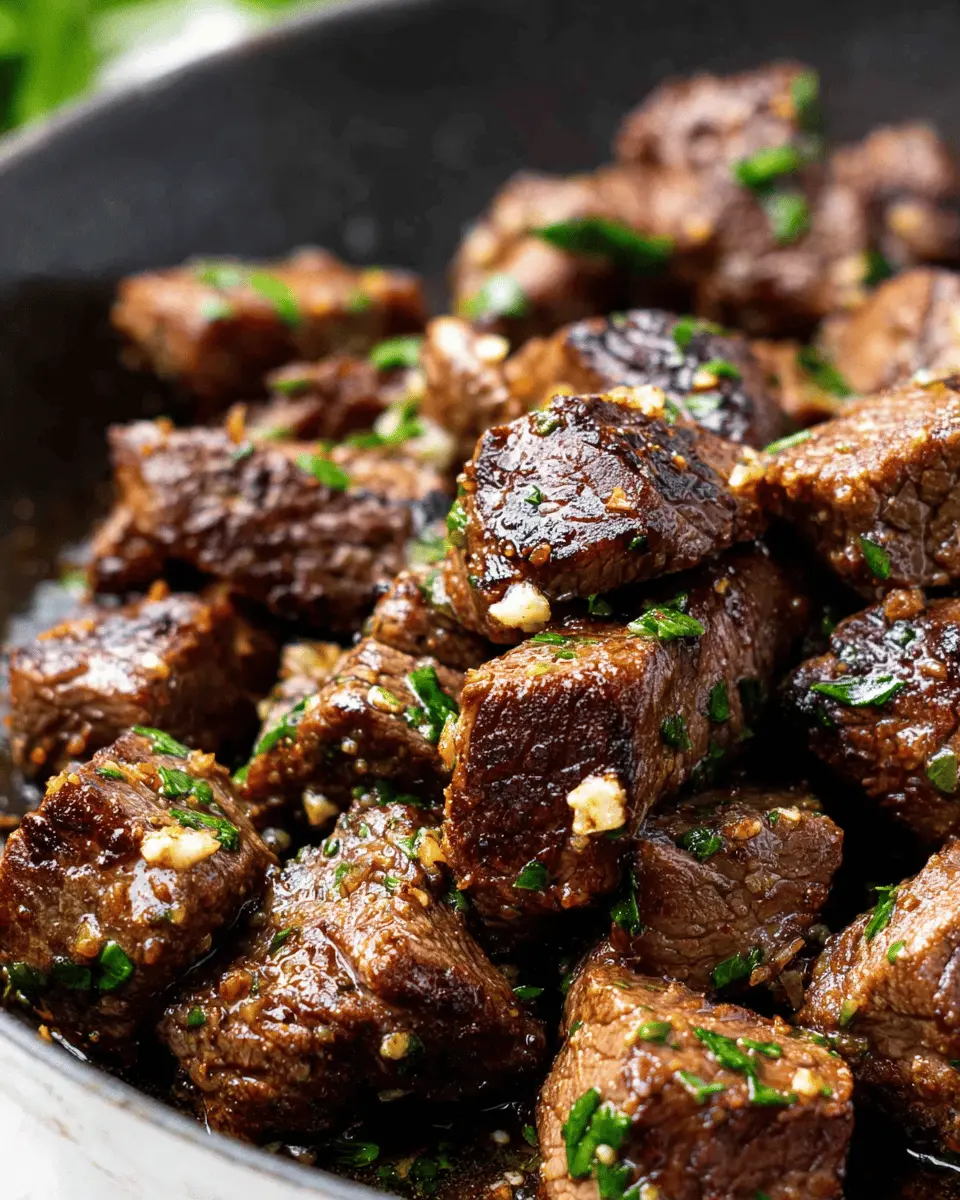 - Pour the garlic butter over the steak bites and toss well. Garnish with parsley and serve.