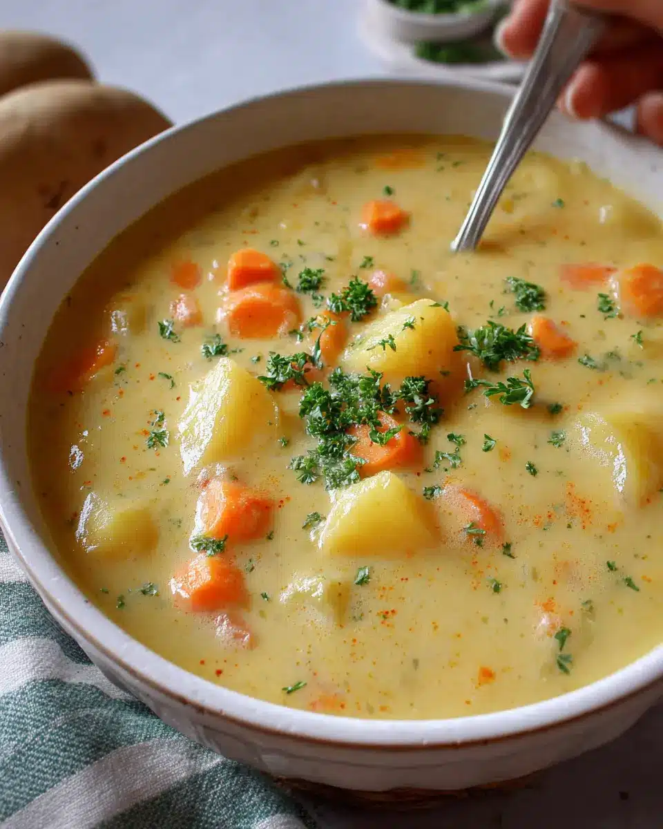 This simple soup is rich in complex carbohydrates from the potatoes, providing energy, while the vegetables contribute essential vitamins and minerals. The inclusion of dairy-free cream adds a creamy texture without dairy, making it a delicious, wholesome meal for everyone.