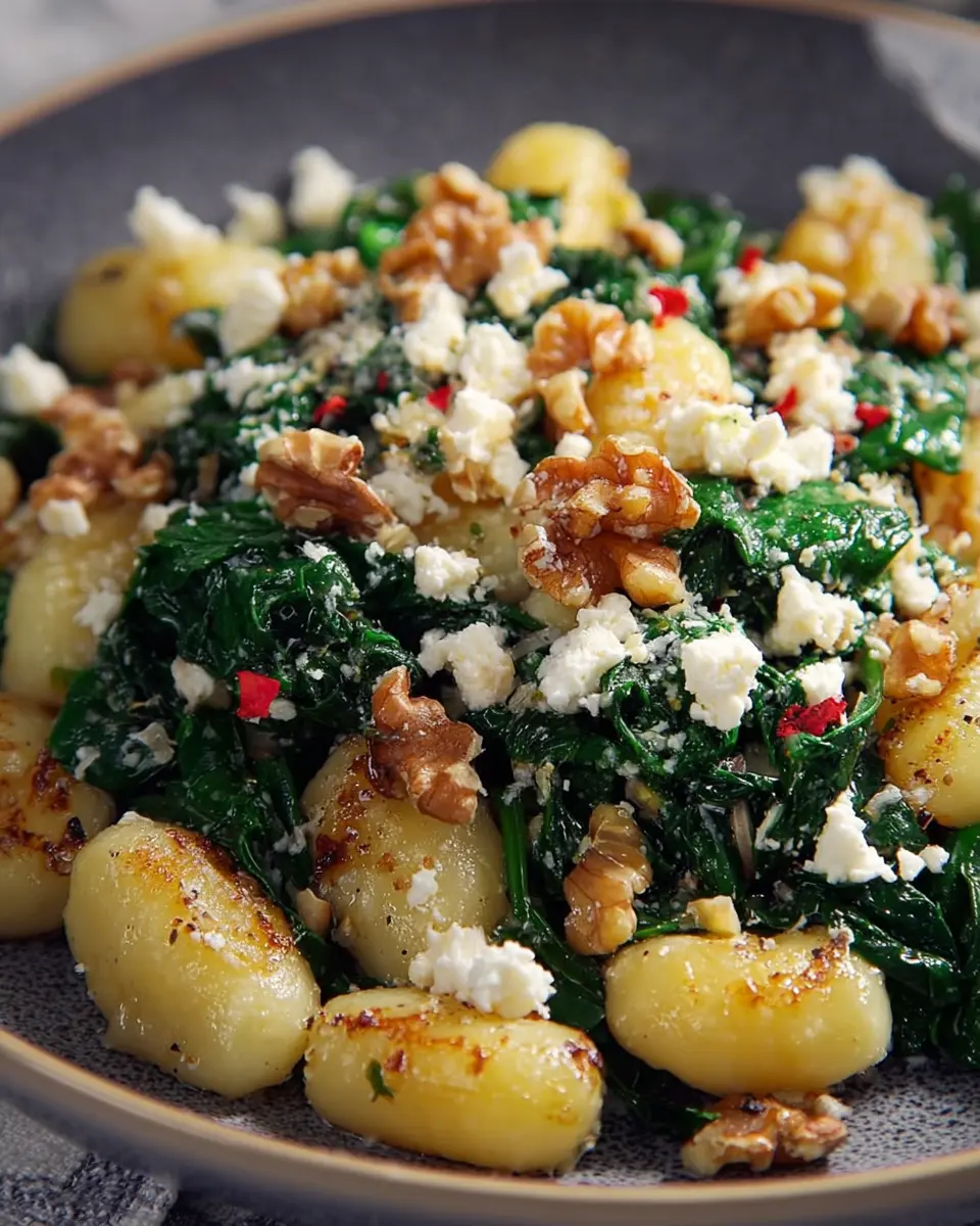 When it comes to serving your gnocchi with spinach, feta, and walnuts, consider garnishing it with a sprinkle of freshly ground black pepper and a bit more feta on top for an added touch of creaminess. You can pair this dish with a simple green salad or some crusty bread for a delightful meal. Don’t hesitate to invite friends over for a cozy dinner; this dish is sure to impress!