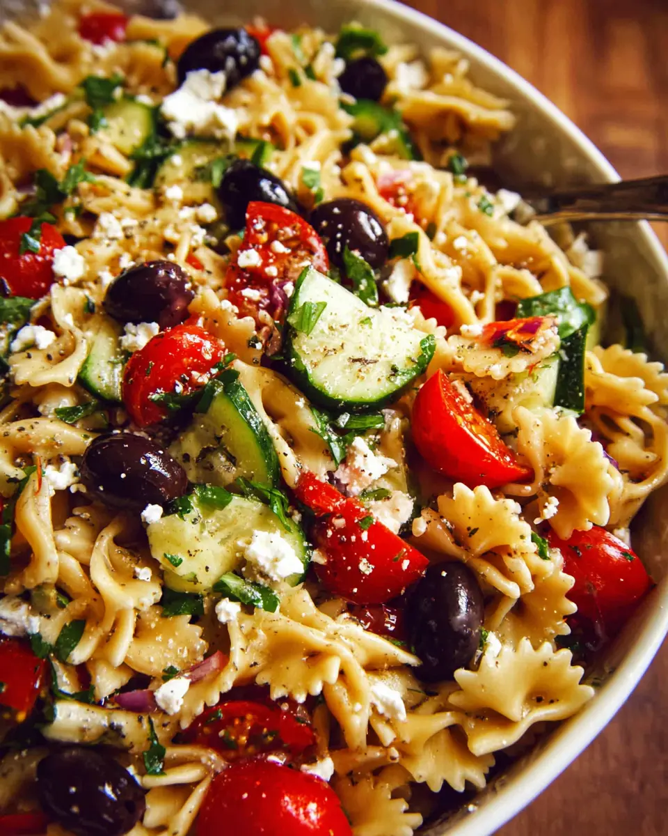 In summary, Greek Pasta Salad serves as a vibrant, nutritious meal perfect for any occasion. With its delightful combination of fresh vegetables, hearty pasta, and zesty dressing, it's not just a side dish; it's a complete dish that everyone loves. Enjoy it at picnics or as a simple lunch option!