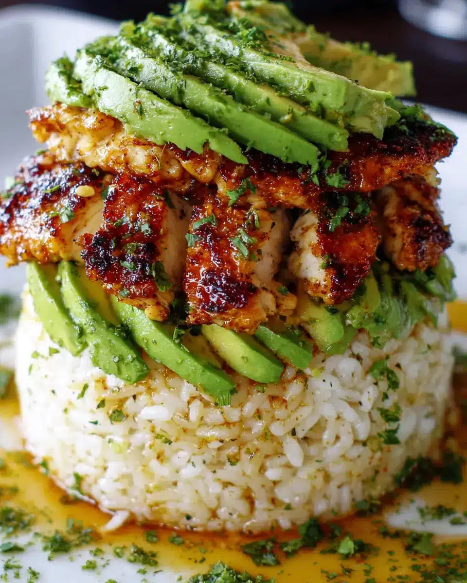 Don’t forget to serve immediately for the best presentation! This Honey Lime Chicken & Avocado Rice Stack not only looks stunning but also tantalizes the taste buds with each bite.