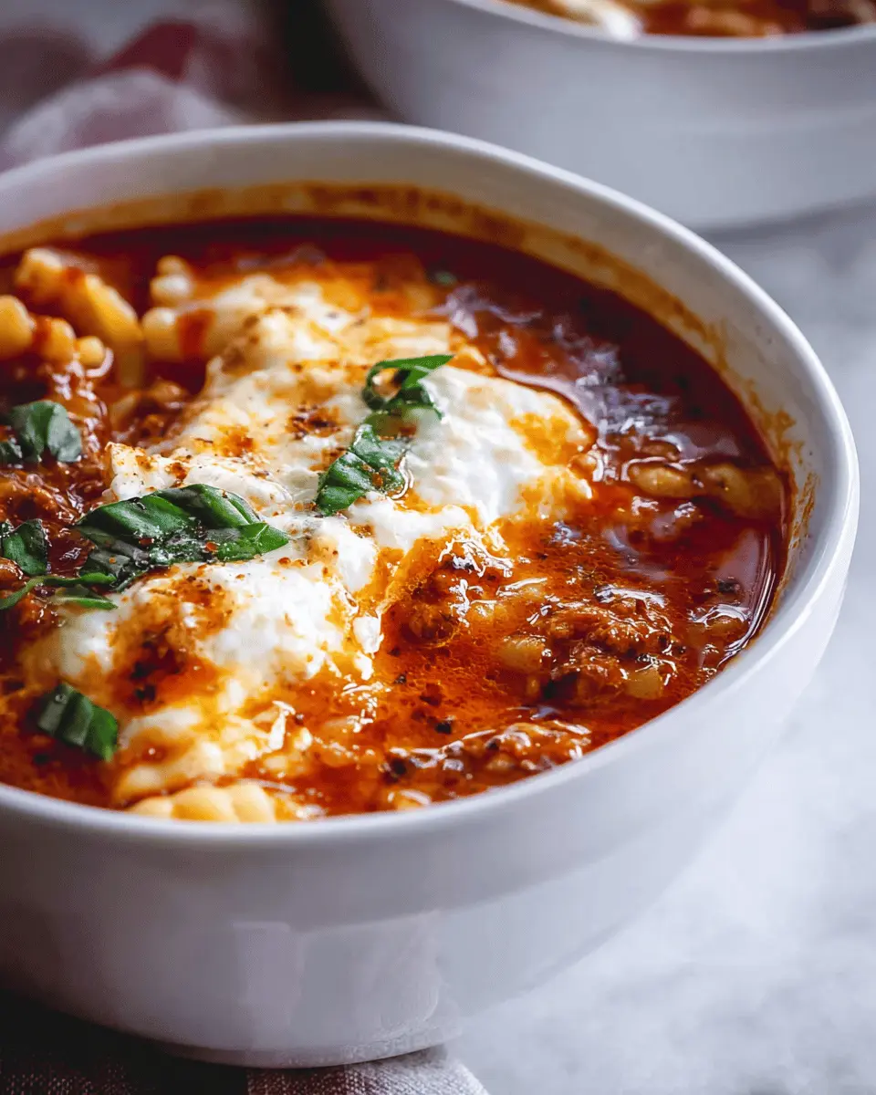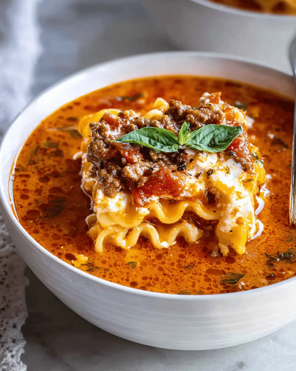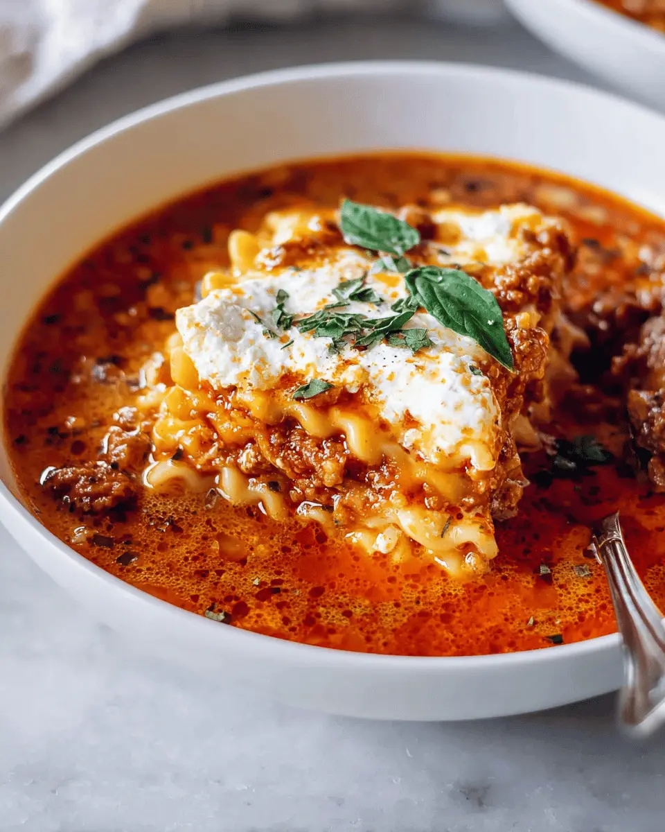 At last, it’s time to savor your creation. Ladle the hot soup into bowls and generously dollop that creamy cheese mixture on top. Finish it off with a sprinkle of fresh basil for that authentic touch. This lasagna soup not only warms your belly but also your heart, making it a perfect meal for any occasion.