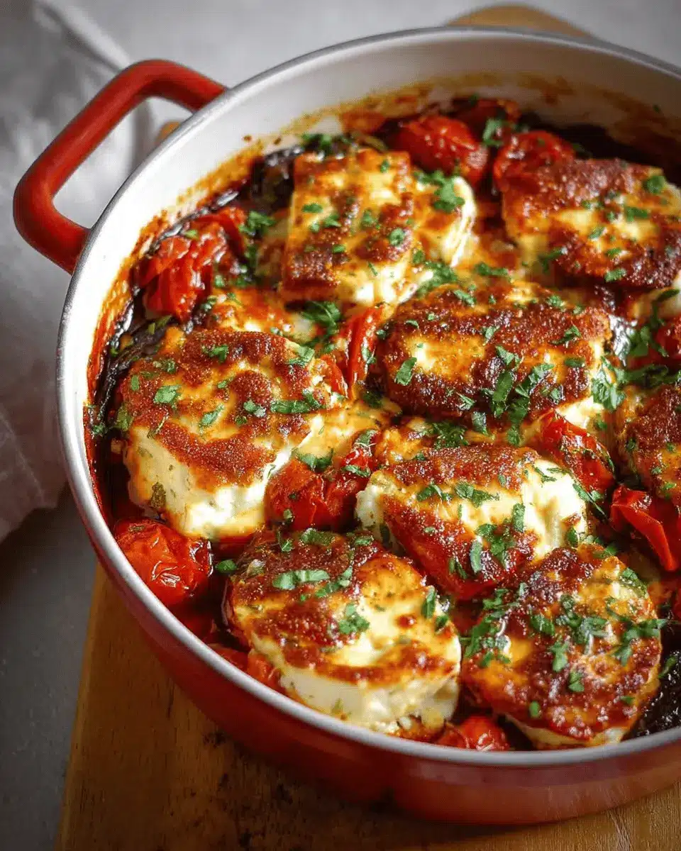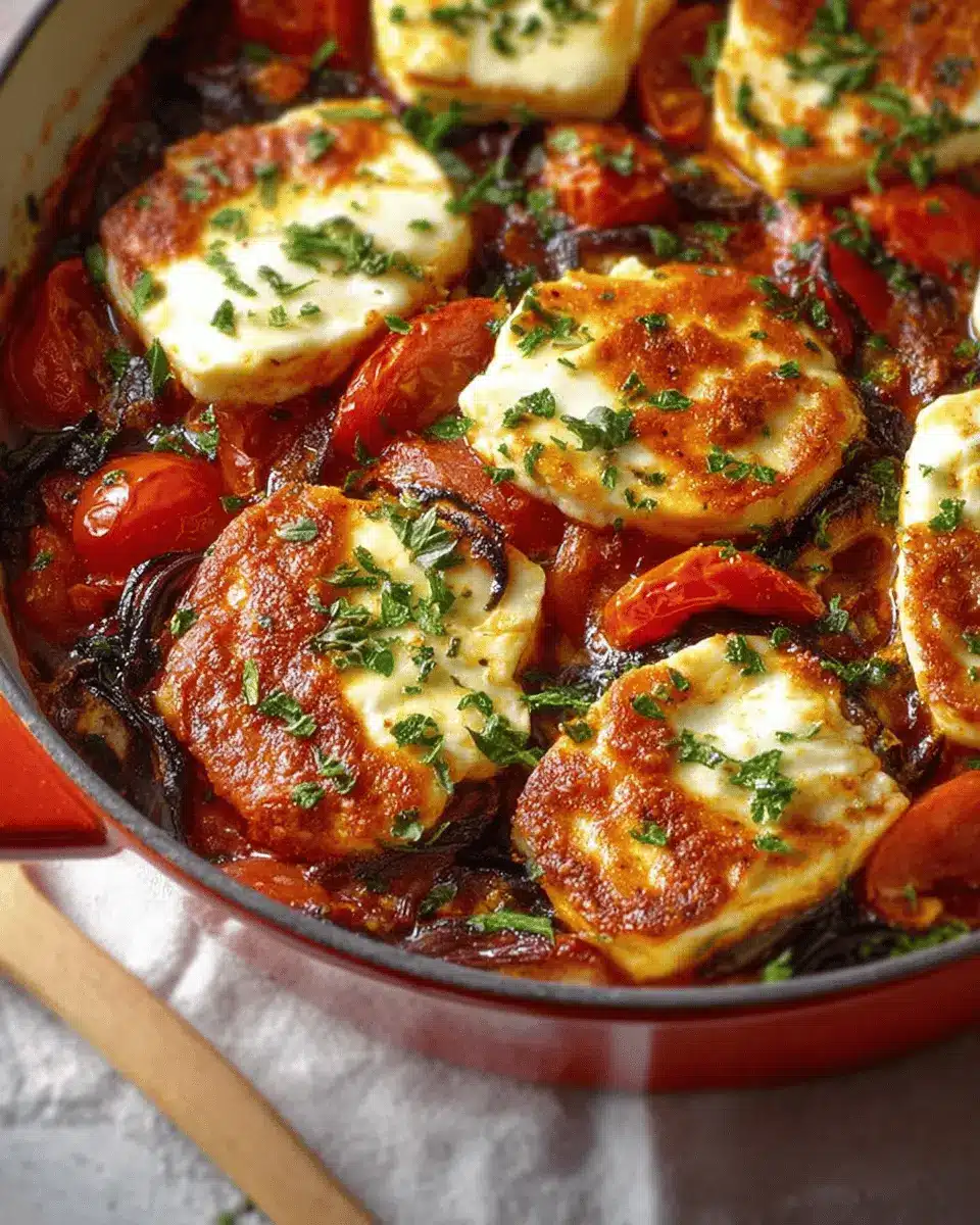 Finally, preheat your grill to a high setting and pop the pan under it for about five minutes. Keep a close eye on it as the cheese turns golden brown and crispy. You’re looking for that delightful contrast between the gooey tomato base and the crunchy, savory halloumi on top. Serve it warm and consider garnishing with fresh parsley or basil for a pop of color!