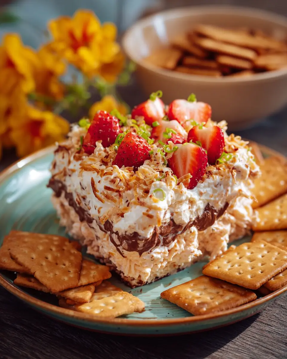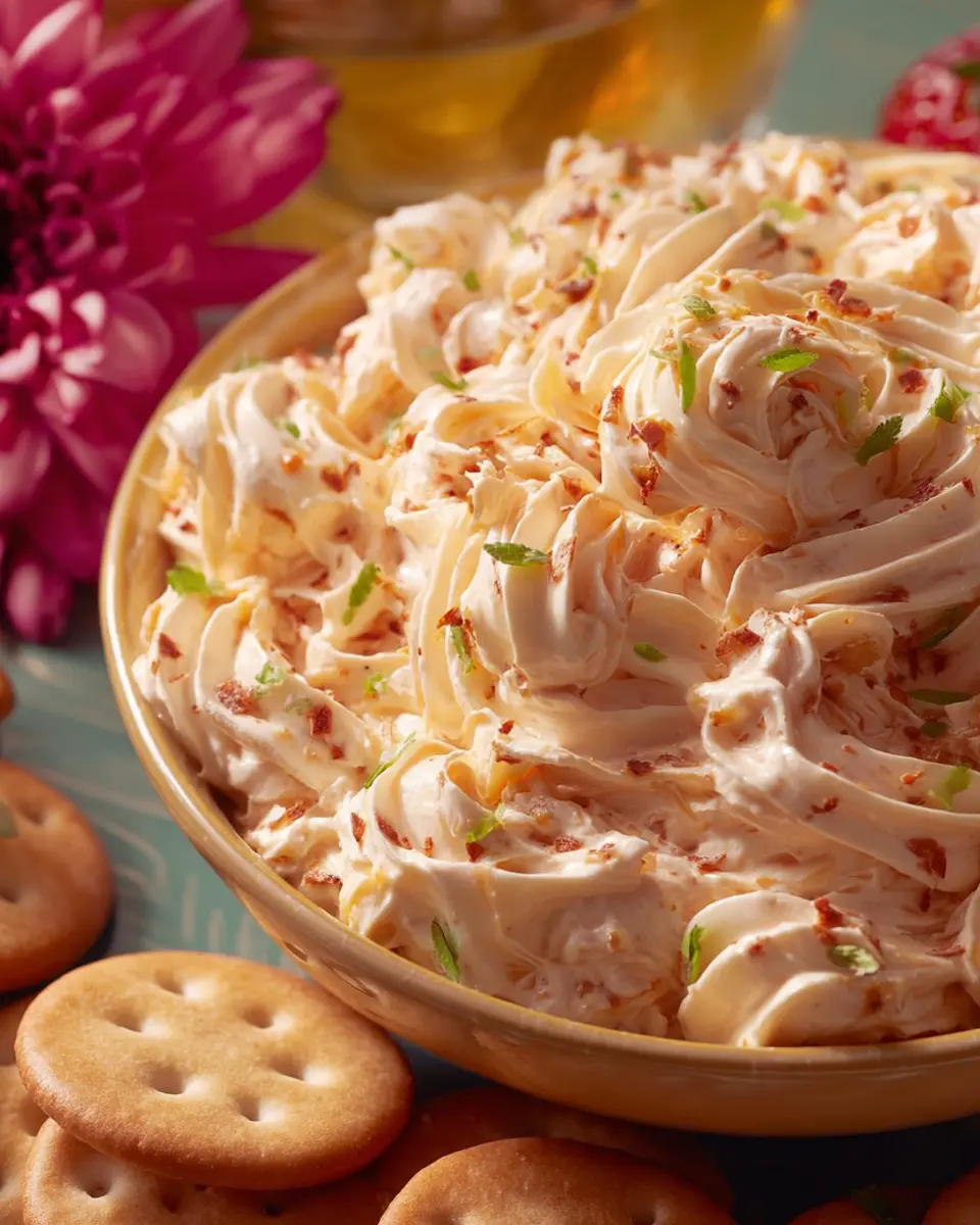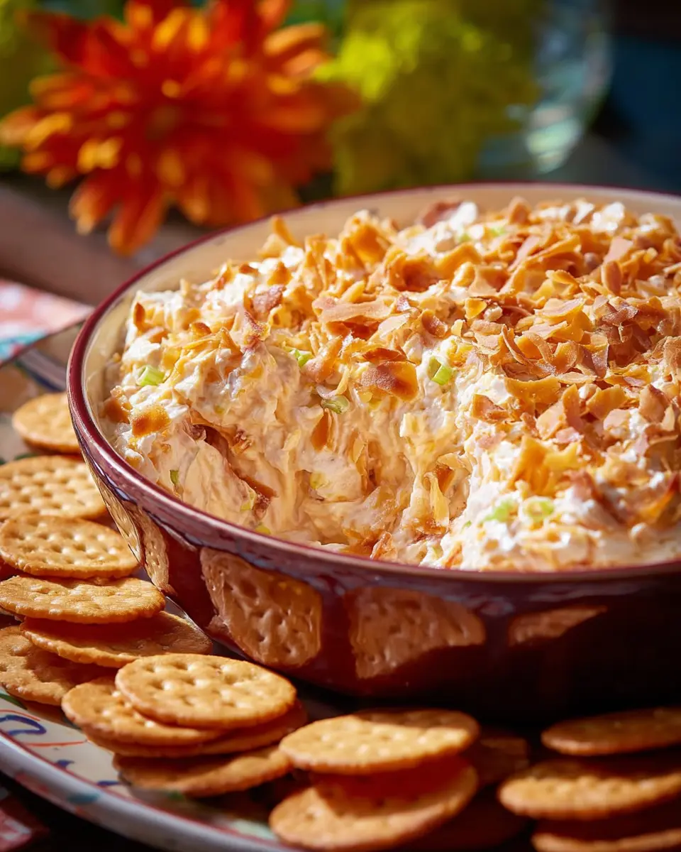 This cooling time is essential; it allows the flavors to blend beautifully. When you're ready to serve, garnish with the remaining sliced green onions, and prepare your favorite buttery crackers or bagel chips for dipping.