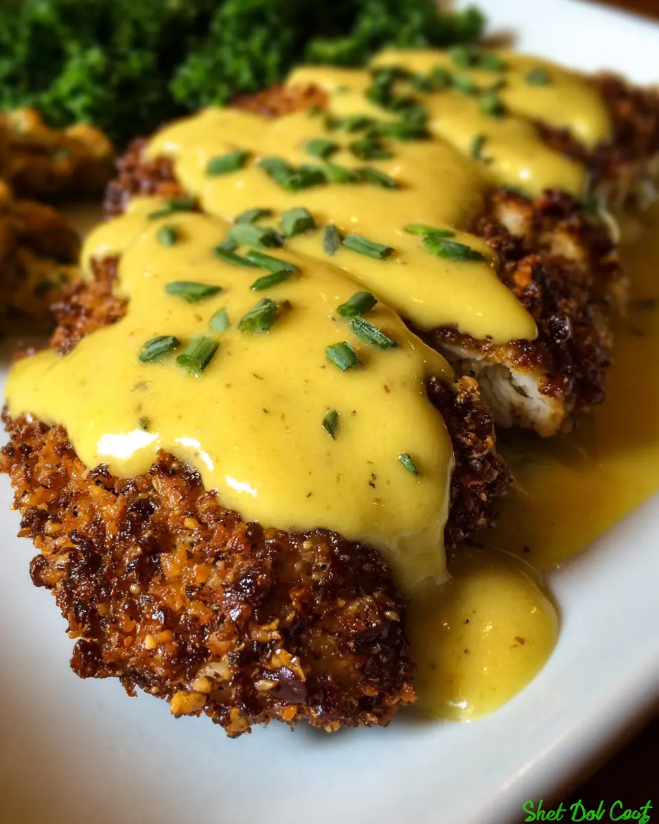 Once your pretzel-crusted chicken breasts are cooked, let them rest on a paper towel-lined plate to absorb the excess oil. Transfer them to serving dishes and drizzle generously with the cheesy-mustard sauce. Don’t forget to garnish with chopped parsley for that extra pop of color!