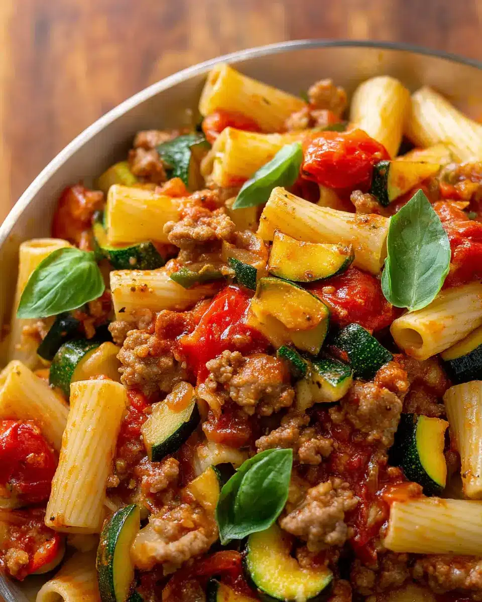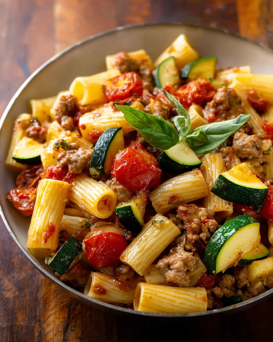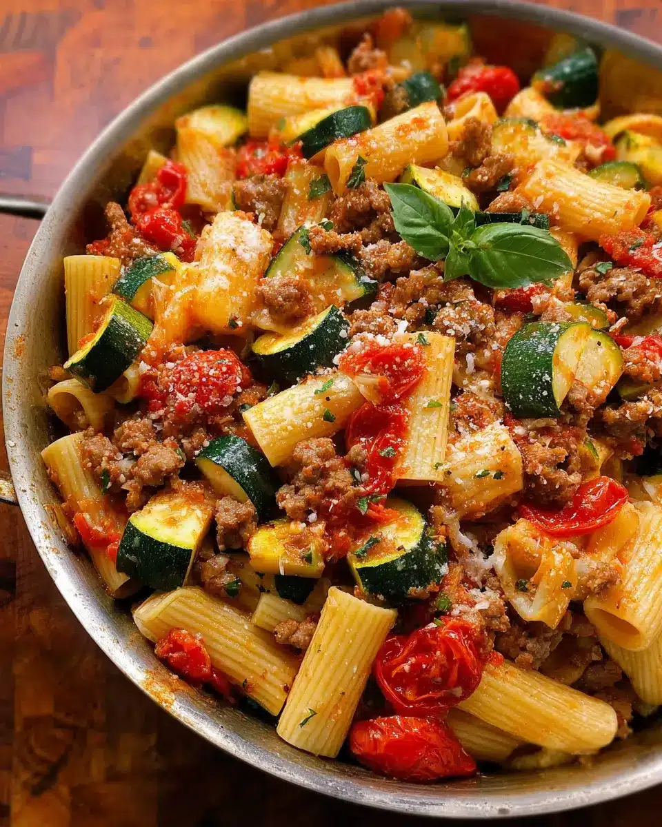 The magic happens in just 25-30 minutes. You’ll start by sautéing the onions and sausage, then let the tomatoes and zucchini come together in a flavorful sauce while your rigatoni cooks to perfection.