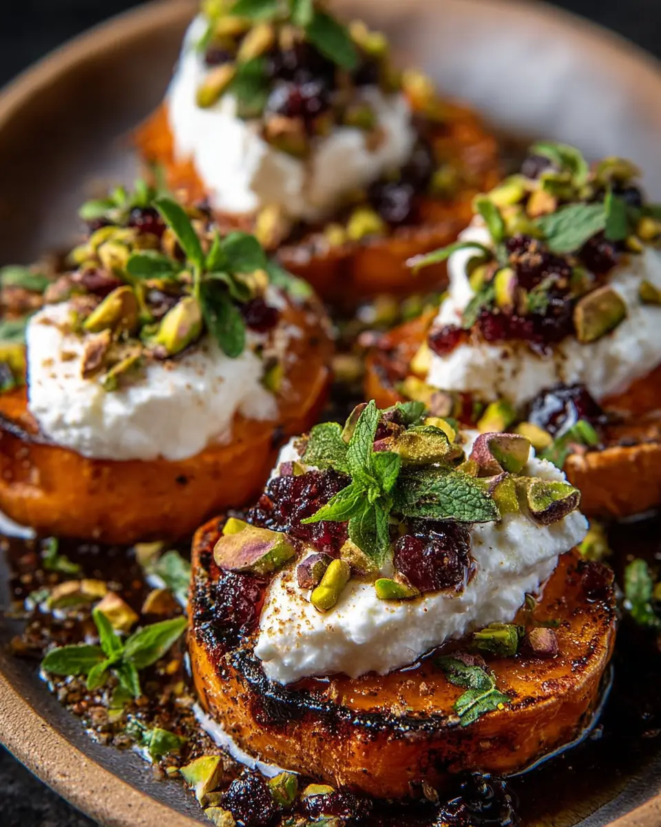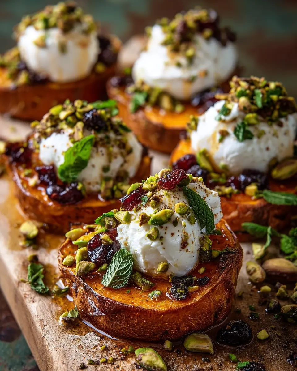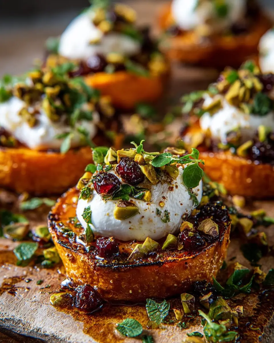 Roasted Sweet Potato Rounds with Burrata and Pistachios