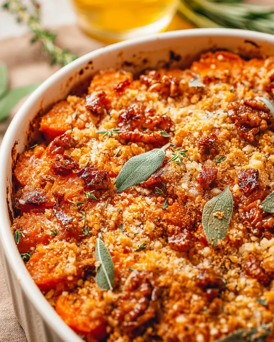 With your savory sweet potato casserole base prepped, it’s time to work on the topping. Lower your oven temperature to 375°F (190°C). If you love a nutty crunch, toast the walnuts in a skillet until fragrant. Combine these nuts with panko breadcrumbs, more Parmesan cheese, melted butter, minced fresh sage, salt, and black pepper in a medium bowl.