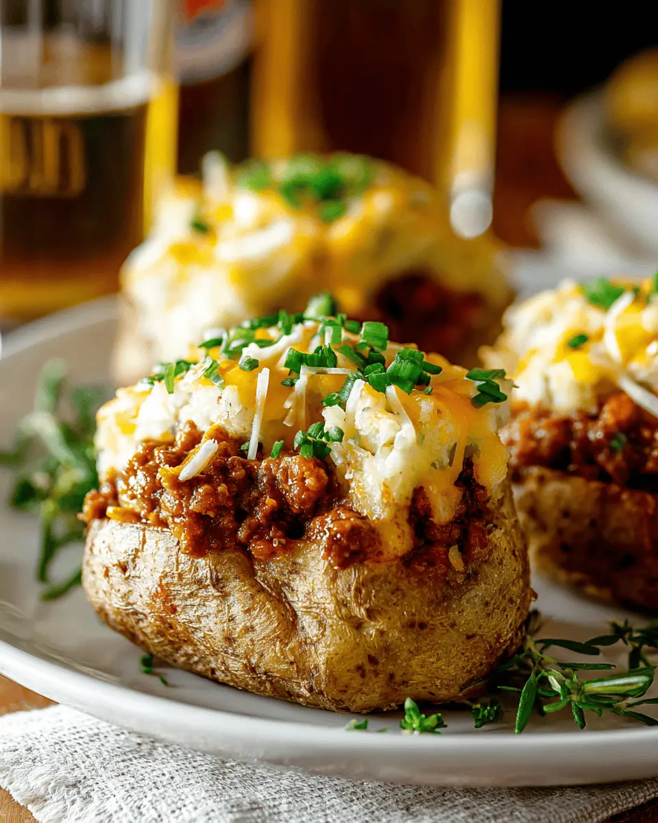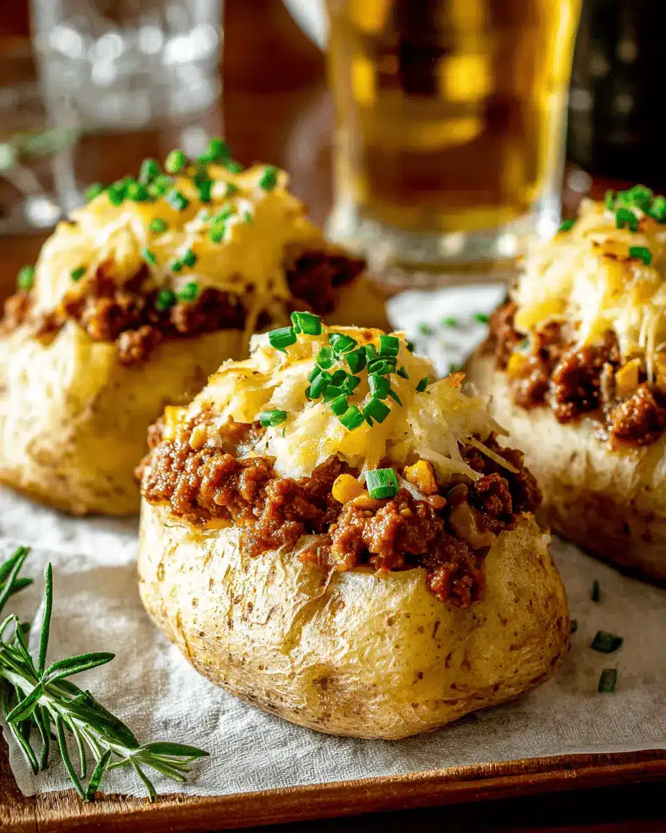 Your potatoes should be perfectly baked by now! Carefully cut each potato lengthwise to create a pocket. Spoon that hearty beef mixture generously over the potatoes. If you’re feeling cheesy (and who isn’t?), sprinkle ¾ cup of shredded extra sharp cheddar on top. For an extra layer of flavor, consider garnishing with some fresh herbs. Finally, pop them back into the oven for a brief spell to meld all those flavors together. Once it’s all set, serve and enjoy your Shepherd’s Pie Baked Potatoes with the satisfaction of having created a wholesome meal from scratch.