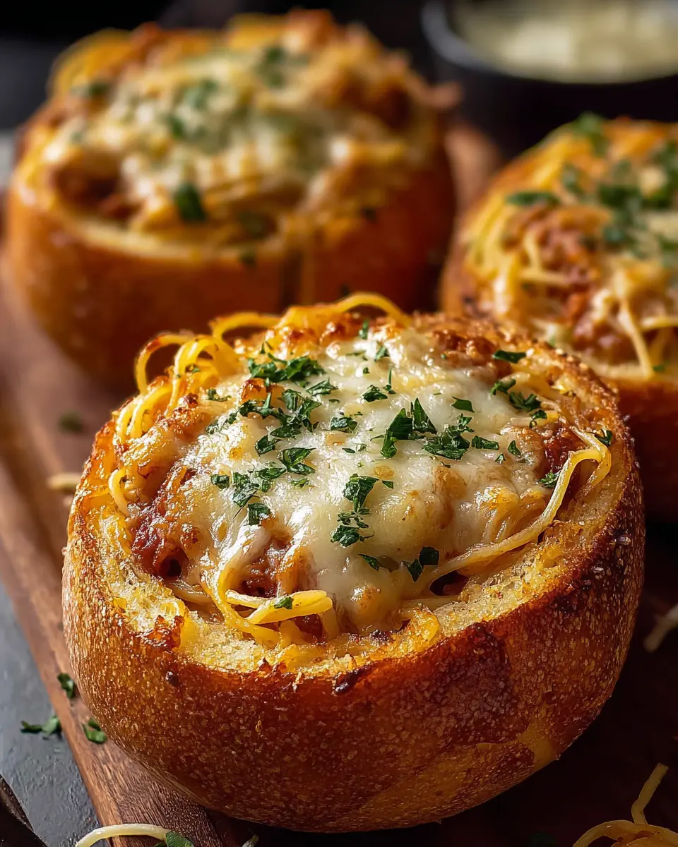 Now comes the fun part—filling your bread bowls! Place them on a baking sheet, then spoon in the spaghetti and meat sauce generously, piling high for the best presentation. Top each bowl with a hearty layer of shredded mozzarella cheese. If you’re looking for that gooey, melted goodness, don’t hold back on the cheese!