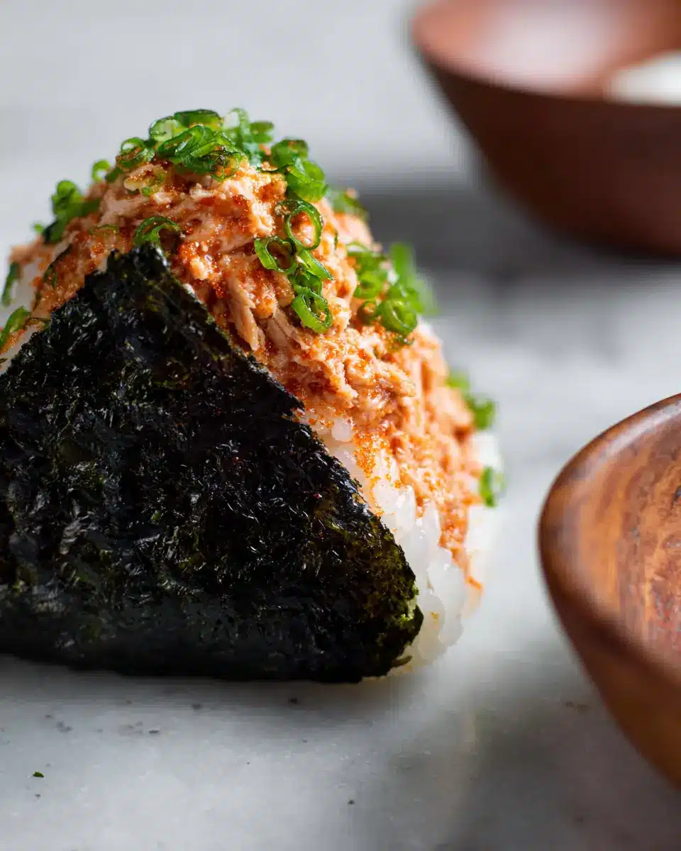 Make your spicy tuna onigiri a visual delight! Serve them on a colorful platter and sprinkle with toasted black sesame seeds for an elegant touch. You can also use vibrant garnishes like sliced radishes or fresh herbs to liven up the presentation. Wrapping the onigiri in nori adds texture and visual appeal—consider cutting the nori into fun shapes for a playful twist!