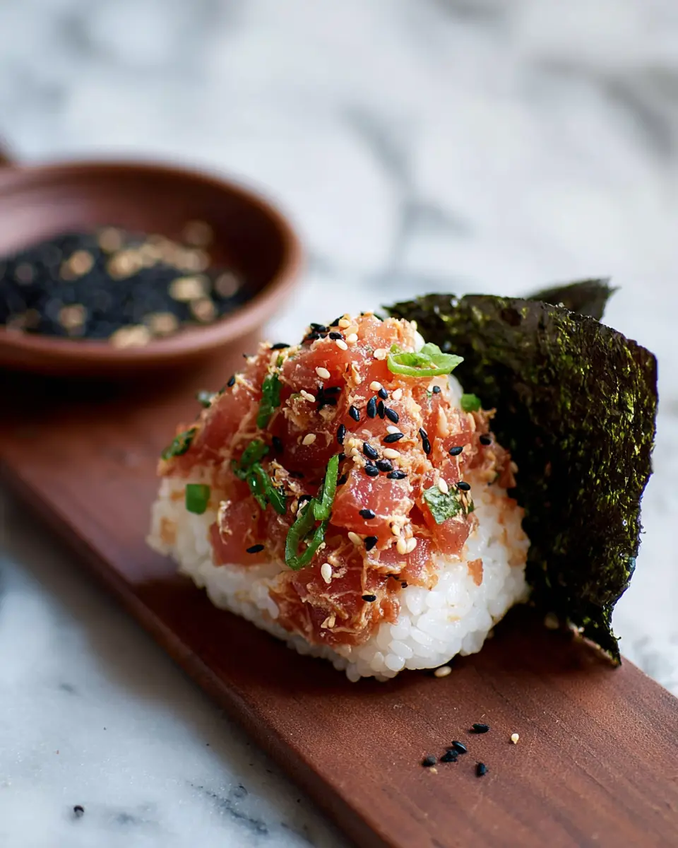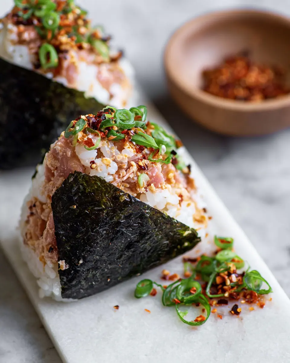 Make your spicy tuna onigiri a visual delight! Serve them on a colorful platter and sprinkle with toasted black sesame seeds for an elegant touch. You can also use vibrant garnishes like sliced radishes or fresh herbs to liven up the presentation. Wrapping the onigiri in nori adds texture and visual appeal—consider cutting the nori into fun shapes for a playful twist!