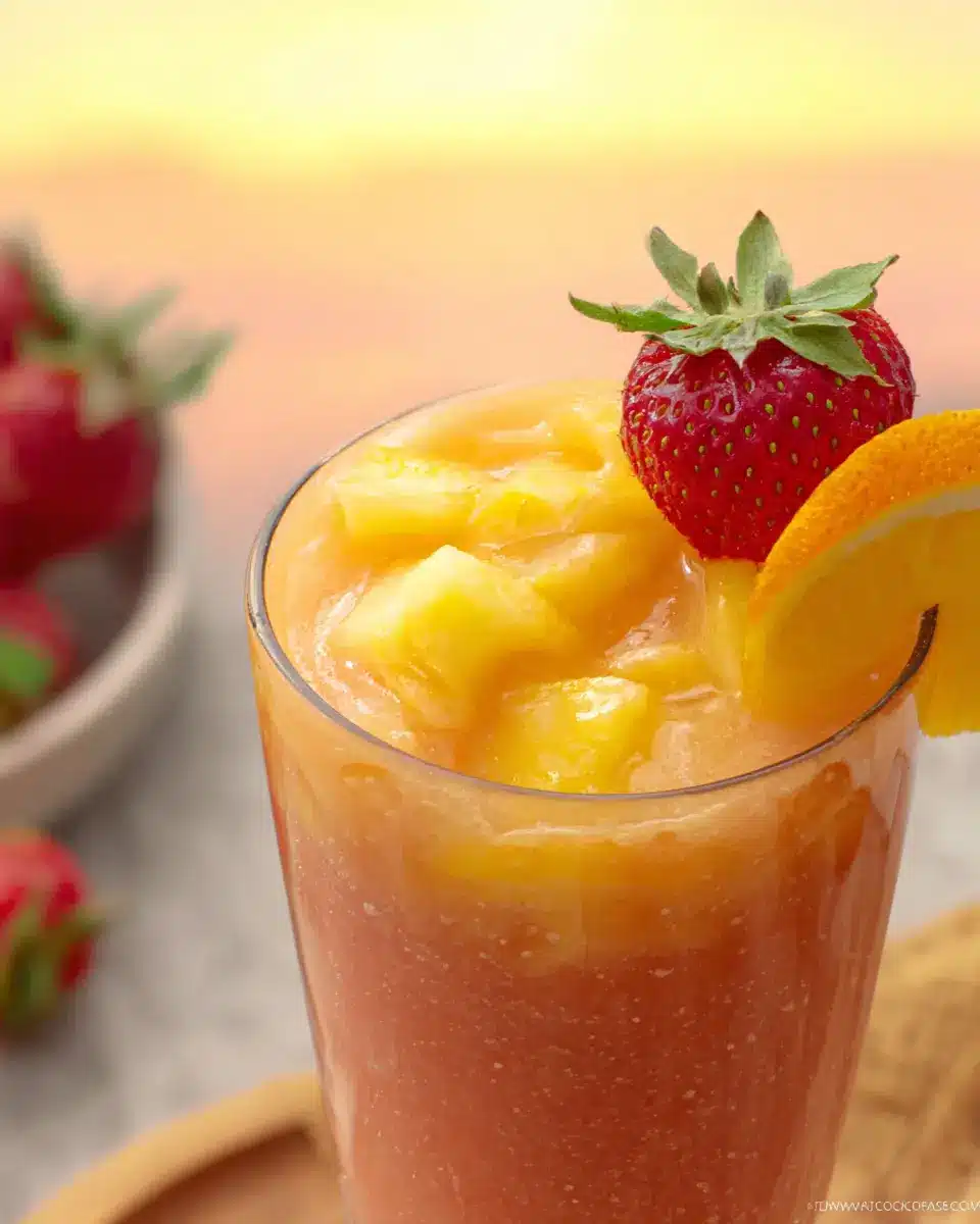 Finally, it’s time to indulge! Pour your blended Sunrise Sunset Tropical Smoothie into glasses. To elevate the experience, consider garnishing with fresh strawberries, mango chunks, or even a sprig of mint. A little presentation can make a big difference and impress your friends or family!