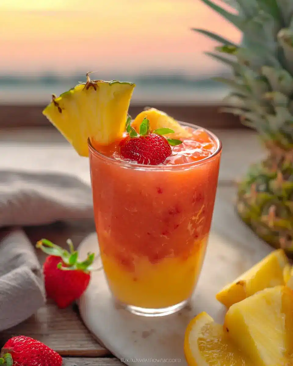 Finally, it’s time to indulge! Pour your blended Sunrise Sunset Tropical Smoothie into glasses. To elevate the experience, consider garnishing with fresh strawberries, mango chunks, or even a sprig of mint. A little presentation can make a big difference and impress your friends or family!