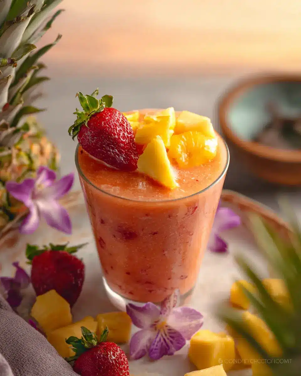 - Divide the smoothie between glasses, garnishing with fresh strawberries, mango, and pineapple. Serve immediately.