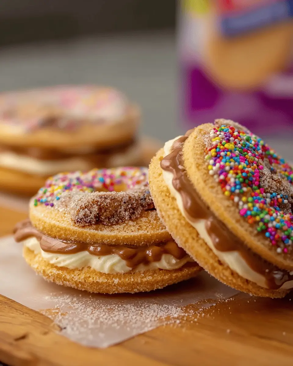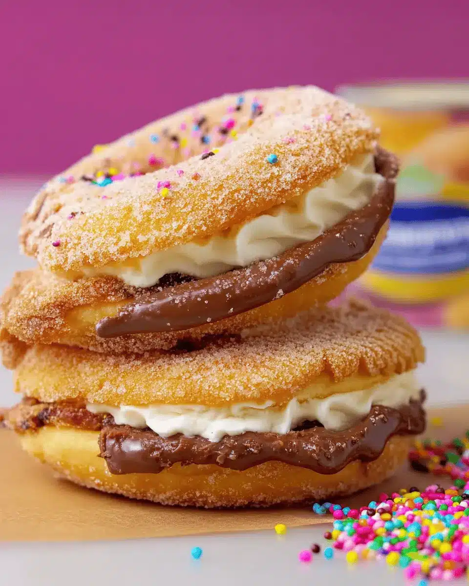 Carefully place each sealed sandwich into the hot oil! Fry for about 8 to 10 seconds on each side or until they turn a crisp, golden brown. Space them out; cooking too many at once can lower the temperature of the oil, leading to soggy donuts. Once done, drain them on paper towels to remove excess oil.